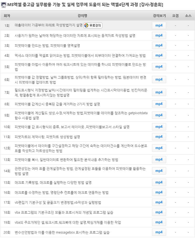 무료회원가입하시면 MS엑셀 중고급 실무활용 기능 및 실제 업무에 도움이 되는 액셀4단계 과정 강의 1회를 무료로 수강할 수 있습니다.