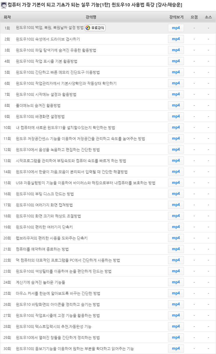 무료회원가입하시면 컴퓨터 가장 기본이 되고 기초가 되는 실무 기능[1탄] 윈도우10 사용법 특강 1회를 무료로 수강할 수 있습니다.