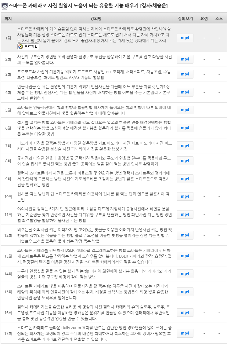 무료회원가입하시면 스마트폰 카메라로 사진 촬영시 도움이 되는 유용한 기능 배우기 강좌 1회를 무료로 수강할 수 있습니다.