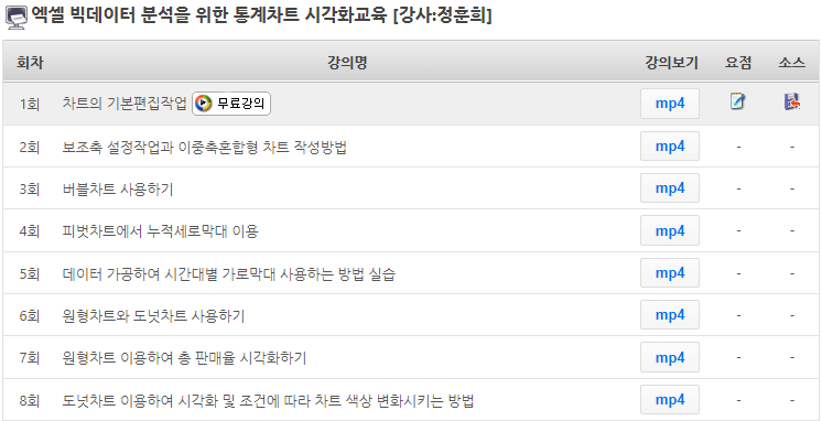 무료회원가입하시면 엑셀 빅데이터 분석을 위한 통계차트 시각화교육 강좌 1회를 무료로 수강할 수 있습니다.