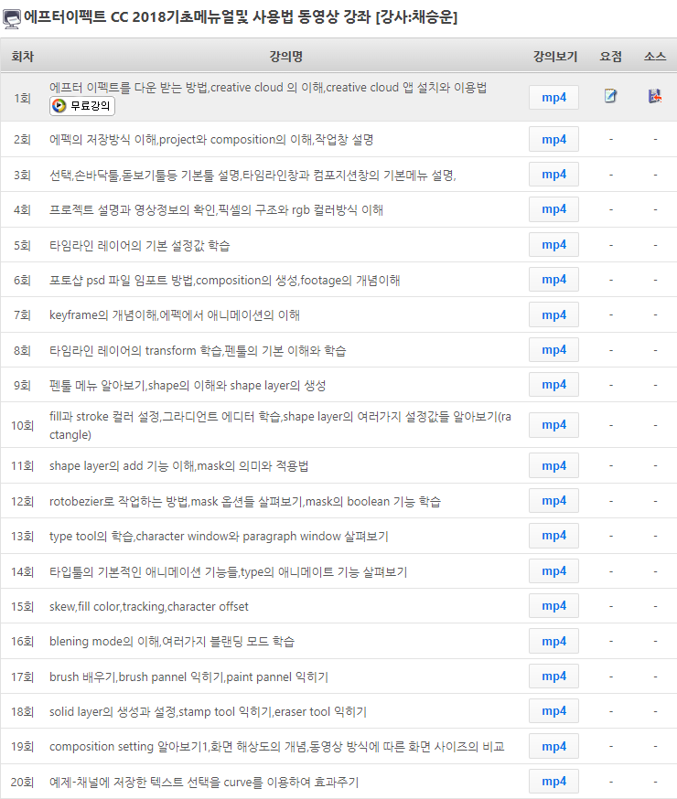 무료회원가입하시면 에프터이펙트 CC 2018기초메뉴얼및 사용법 동영상 강좌 1회를 무료로 수강할 수 있습니다.