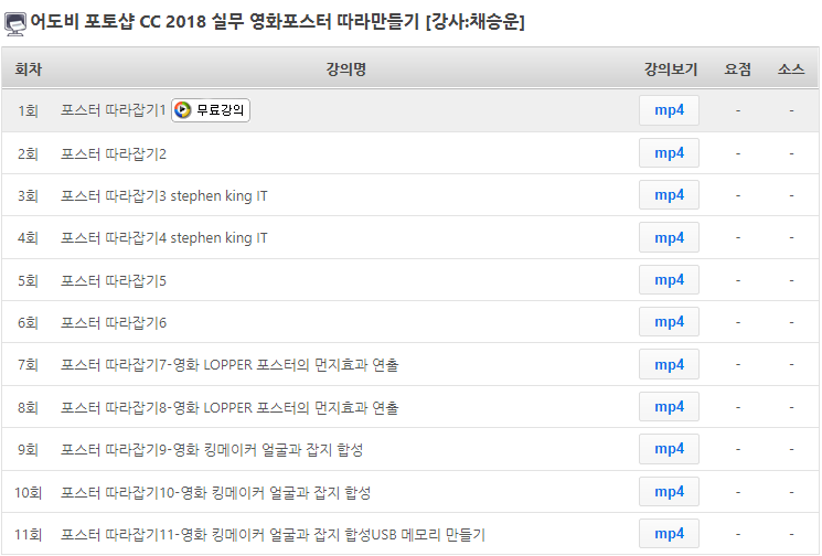 무료회원가입하시면 어도비 포토샵 CC 2018 실무 영화포스터 따라 만들기 강좌 1회를 무료로 수강할 수 있습니다.