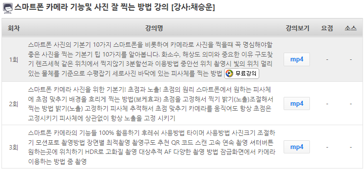 무료회원가입하시면 스마트폰 카메라 기능및 사진 잘 찍는 방법 강의 1회를 무료로 수강할 수 있습니다.