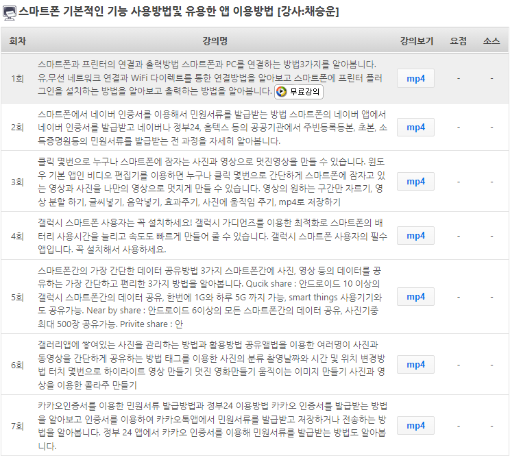 무료회원가입하시면 스마트폰 기본적인 기능 사용방법및 유용한 앱 이용방법 강좌 1회를 무료로 수강할 수 있습니다.