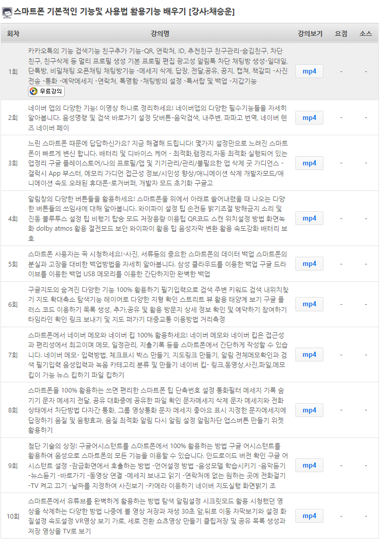 무료회원가입하시면 스마트폰 기본적인 기능및 사용법 활용기능 배우기 강좌 1회를 무료로 수강할 수 있습니다.